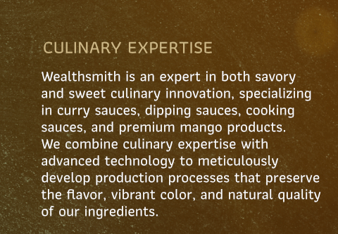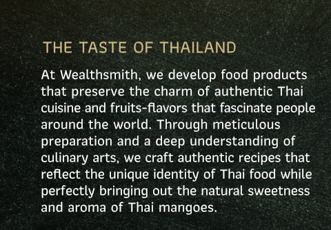 Wealthsmith Co., Ltd. is a manufacturer and distributor of high-quality ready-to-cook curry sauces, dipping sauces, and cooking sauces under the “Boonsmith” brand. We have expanded our expertise to premium Nam Dok Mai mango products under the “Mangosmith” brand, including frozen mango sticky rice, mango ice cream, mango purée, mango sauce, frozen mango, and dried mango.